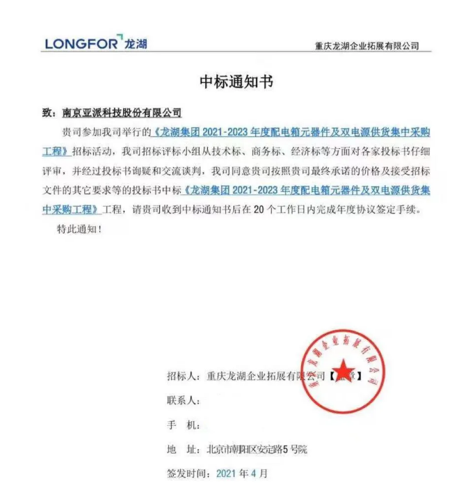亚派科技成功中标“龙湖集团 2021-2023 年度配电箱元器件及双电源供货集中采购工程