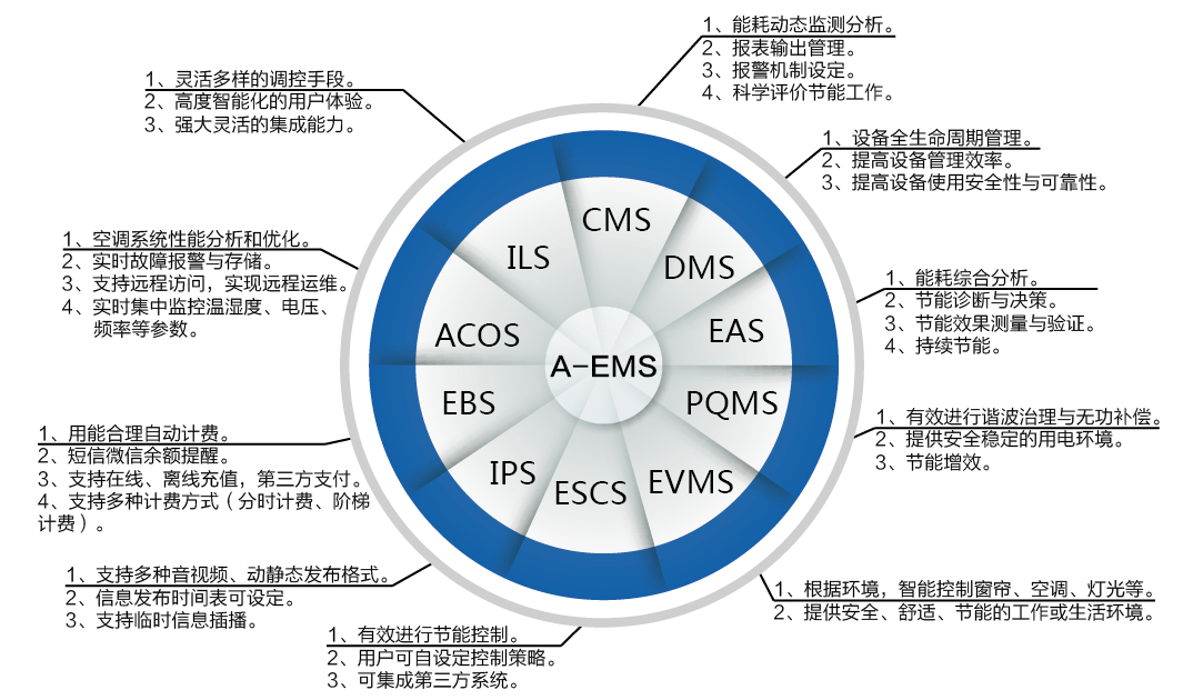 A-EMS主要包含以下几大模块系统:能耗监测系统(CMS)、设备管理系统(DMS)、专家诊断分析系统(EAS)、环境监控系统(EVMS)、电能质量监控系统(PQMS)、节能控制系统(ESCS)、信息发布系统(IPS)、用能计费系统(EBS)、空调改造和优化控制系统(ACOS)、智能照明控制系统(ILS)。