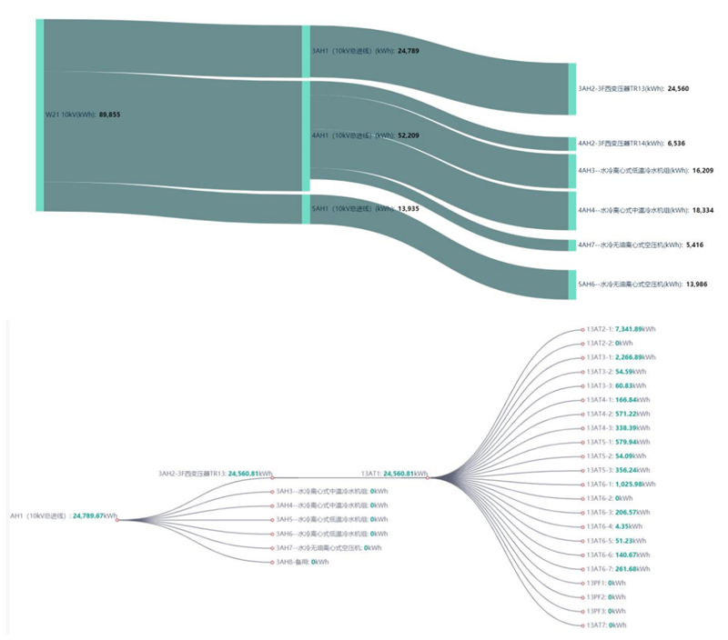 通过不同能源种类(电、水、燃气、蒸汽、冷热量等),不同时间尺度(时、日、周、月、季、年),不同建筑空间结构(厂房、楼层、区域、拉线、工艺方式进行分类),不同系统分类(中低温冷冻水、压缩空气、制氮系统等),重点能耗设备(冷机、冷冻泵、冷却泵、冷却塔、空压机等),不同生产线划分等维度对厂房的能耗进行统计、对比、排名、占比等分析,以直观的柱状图、曲线图、饼图等图表进行展示,帮助管理人员清晰掌握房能耗的来龙去脉。