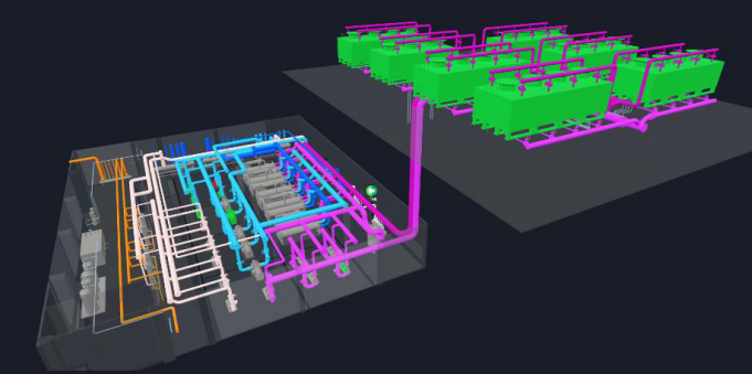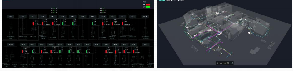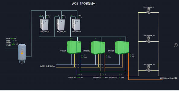 反映低温冷冻水设备(冷机、水泵、冷却塔)与管路的链接关系,直观显示所有中央空调设备的运行状态。