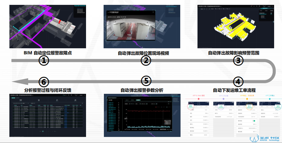 通过跨系统联动模式,形成BIM自动定位报警故障点、自动弹出故障位置现场视频、自动弹出故障影响预警范围、自动下发运维工单流程、自动弹出报警参数分析、 分析报警过程与闭环反馈。
