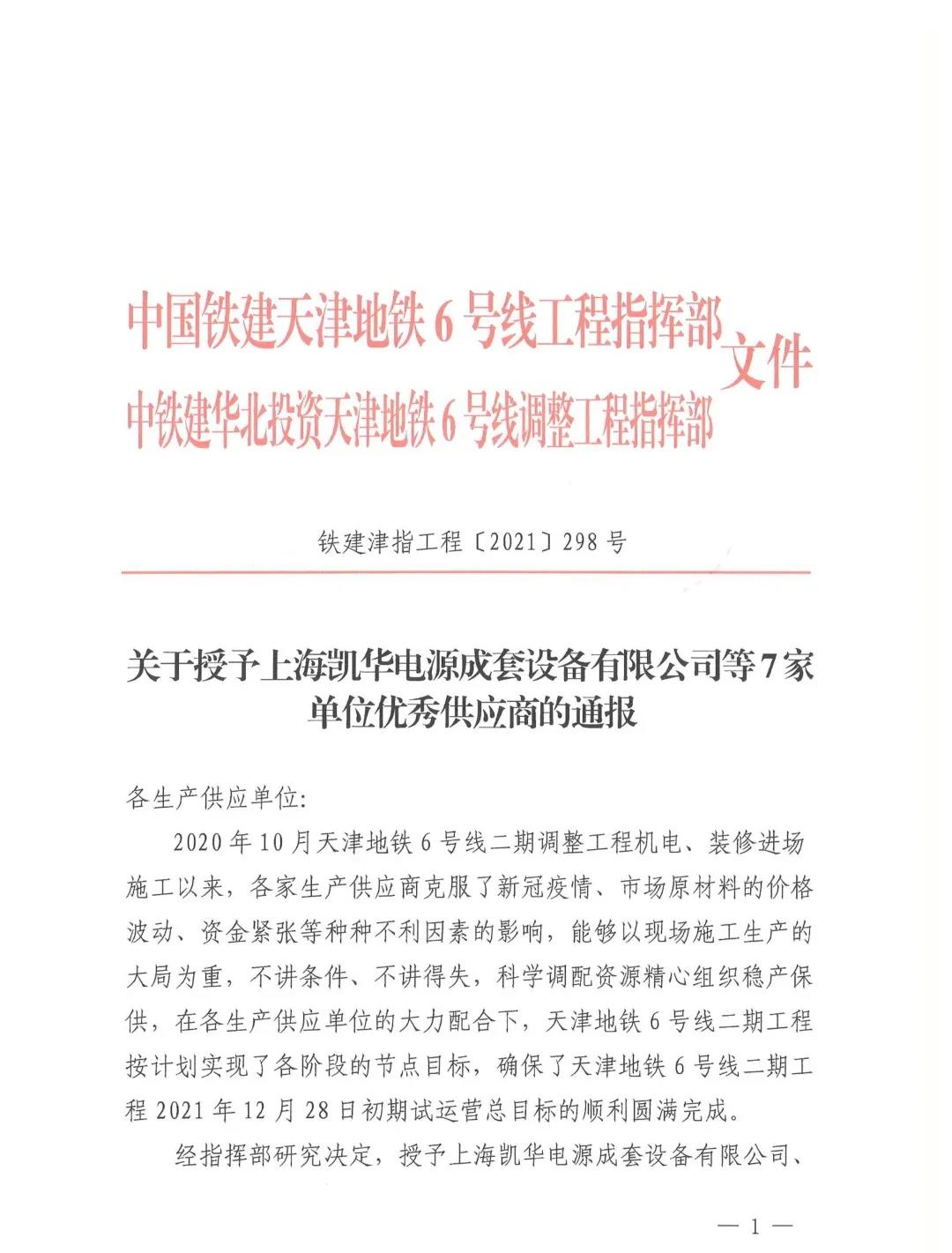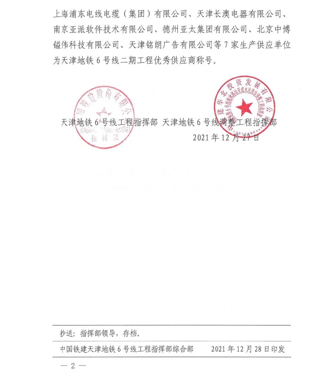 喜报!亚派软件被授予天津地铁6号线二期项目“优秀供应商”称号