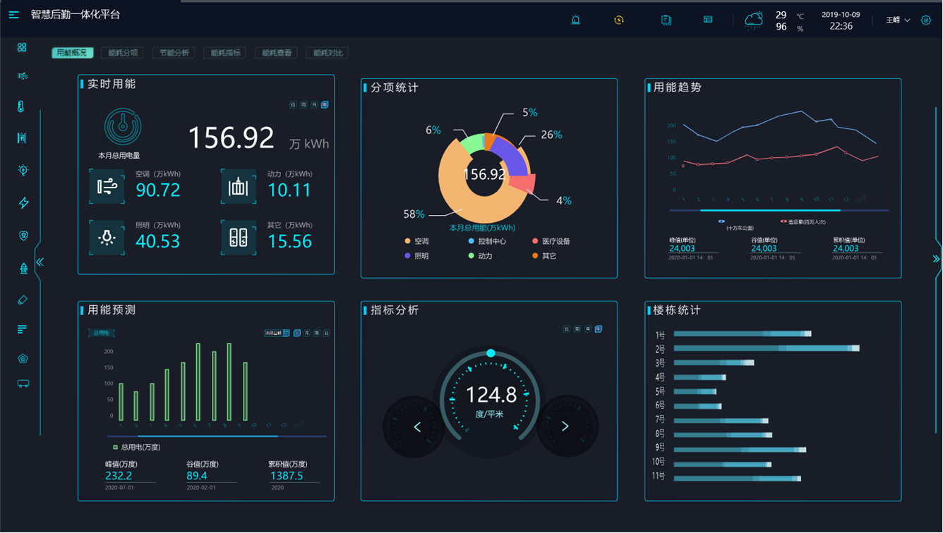能耗管理子系统:通过分类分项能耗实时监测、趋势跟踪与对比,总结医院用能规律,提供用能负荷错峰管理依据,缩短异常能耗发现、定位与处理时间,减少能源浪费;按照医院管理中信息、物资、设备、人员、资金等五大范畴,空间上七大功能区域以及流程与诊疗需要相适应的思路,在医院能源管理系统建设中,创新性应用医院能耗八大率概念,将床位数、住院率、总收入、人员比、设备量、投资额、均摊数以及建筑面积等与能源管理相结合,形成独具特色的医院能源管理考核指标。