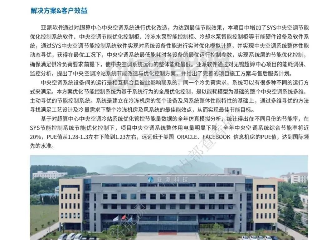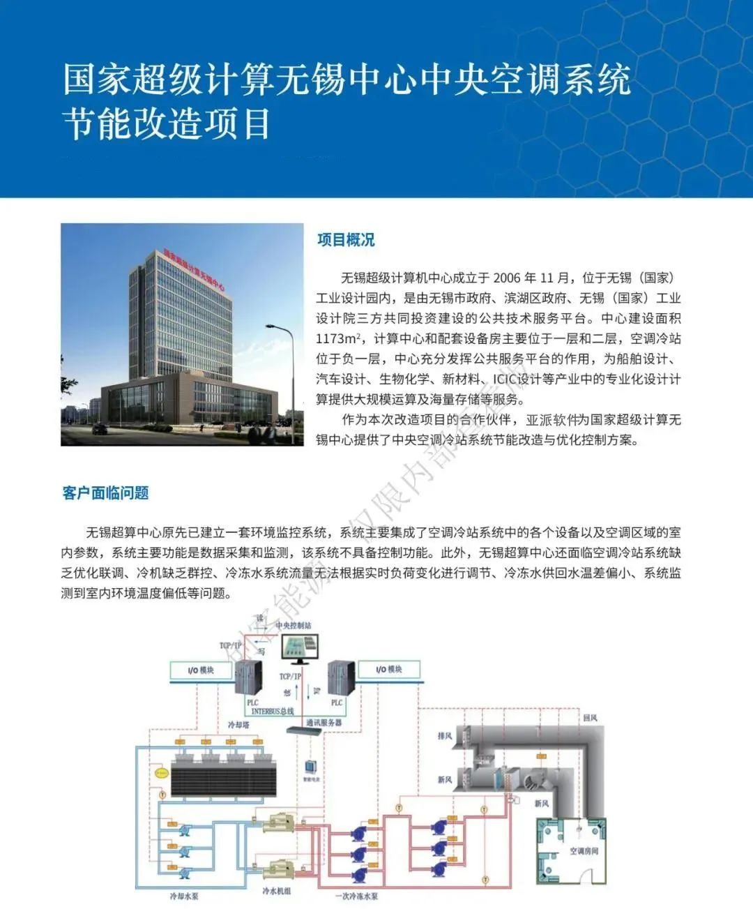 亚派软件国家超级计算无锡中心中央空调系统节能改造项目在智慧能源管理系统、信息化技术和标准、应用技术等方面都有所创新,对国内综合能源服务产业的发展起到一定带动作用。