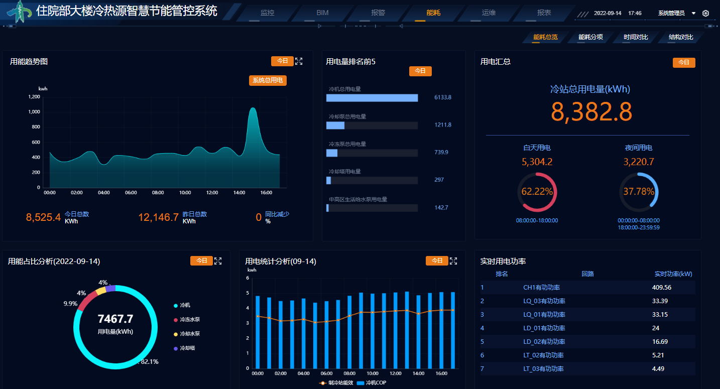 医院中央空调能耗高,中央空调运行管理专业性强是医院后勤管理的痛点。本项目搭建一套基于BIM的中央空调节能优化控制系统,实现了设备自动连锁启停一键控制,可根据负荷变化自动加减载,在满足住院楼末端空调需求的基础上实现机房整体能耗最低、整体运行指标最优化。同时,系统中的报警管理、能耗管理、运维管理和报表管理等功能不仅实现了中央空调系统的主动性管控,也实现了热水机房的生活热水及生活给水系统的高效运行监管。
